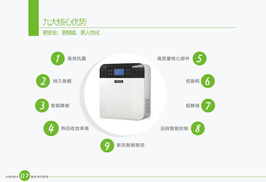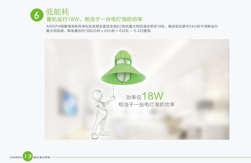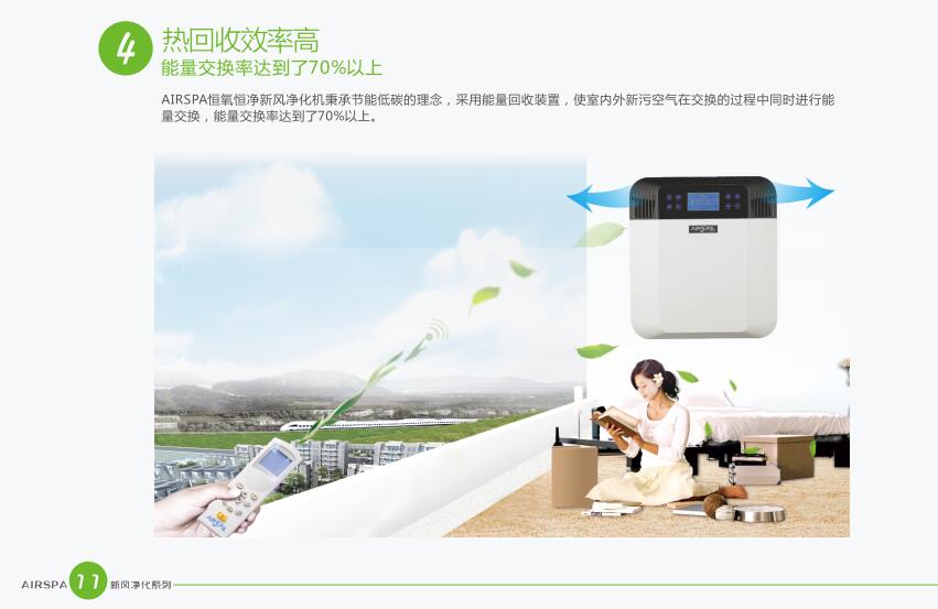 AIRSPA恒氧恒凈新風凈化機秉承節(jié)能低碳的理念,采用能量回收裝置,是室內外新污空氣在交換的過程中同時進行能量交換,能量交換率達到了70%以上。